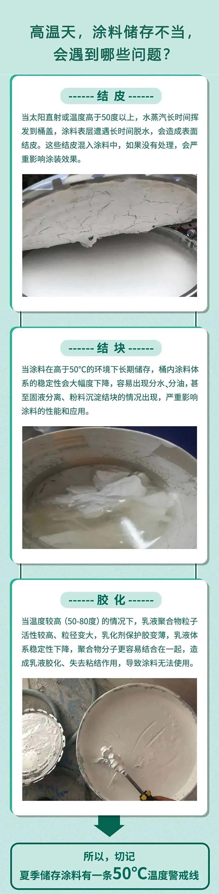 夏天的高溫天氣即將到來。水性涂料在高溫環境下儲存,或者遭遇長時間的太陽直曬,會導致桶身和桶蓋金屬材質溫度迅速升高,使得與其接觸的涂料,特別是表層涂料出現結皮、結塊、膠化等現象,影響涂料的正常使用。
